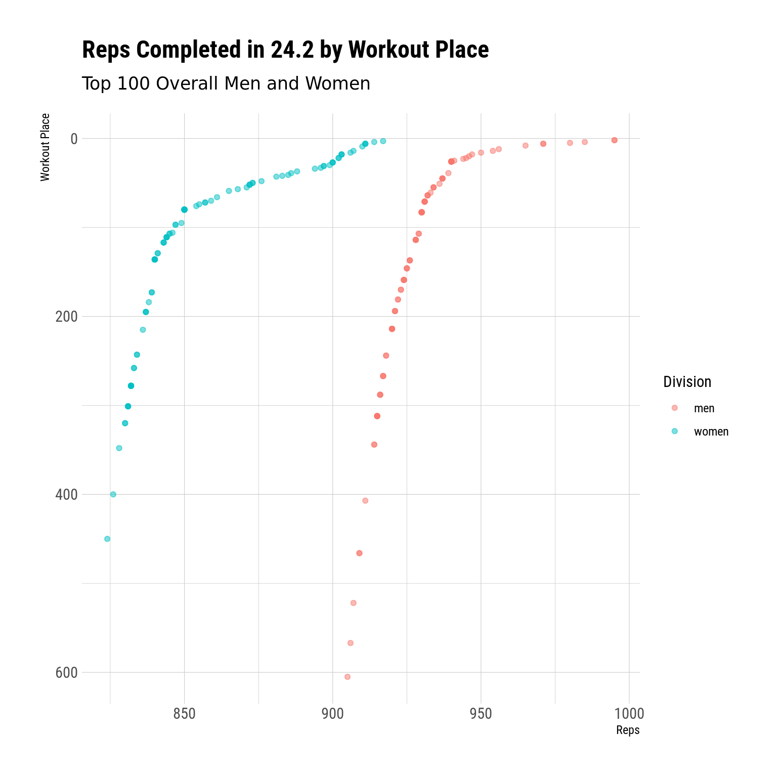 wk2 <- all_workouts |>filter(workout_num ==2) |>mutate(n_reps =parse_number(score))wk2 |>ggplot(aes(x = n_reps, y = workout_place, color = div)) +geom_point(alpha = .5) +scale_y_reverse() +scale_color_discrete(name ="Division") +labs(x ="Reps",y ="Workout Place",title ="Reps Completed in 24.2 by Workout Place",subtitle ="Top 100 Overall Men and Women" )