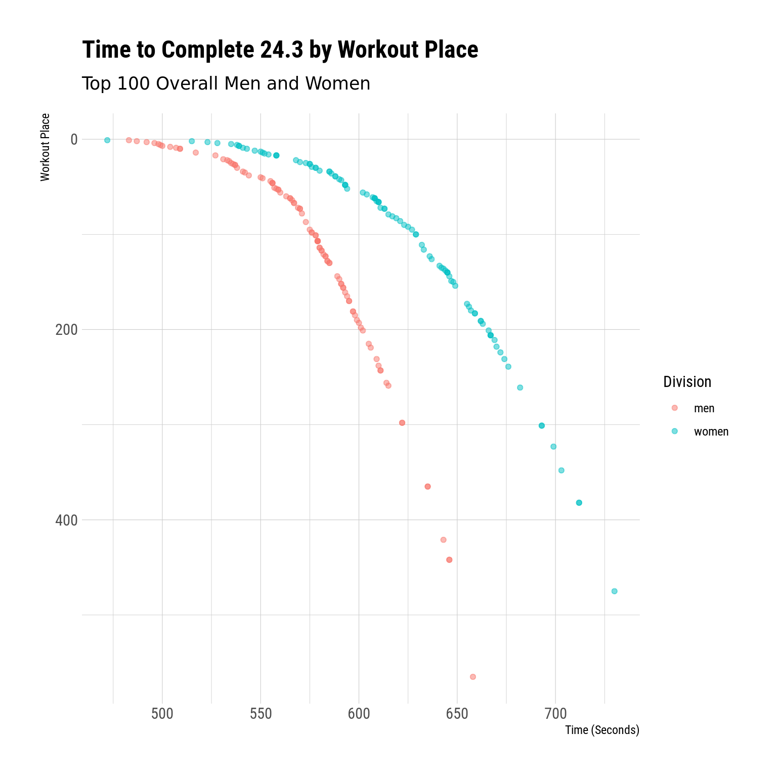 wk3 <- all_workouts |>filter(workout_num ==3) |>mutate(time_score =period_to_seconds(ms(score)))wk3 |>ggplot(aes(x = time_score, y = workout_place, color = div)) +geom_point(alpha = .5) +scale_y_reverse() +scale_color_discrete(name ="Division") +labs(x ="Time (Seconds)",y ="Workout Place",title ="Time to Complete 24.3 by Workout Place",subtitle ="Top 100 Overall Men and Women" )