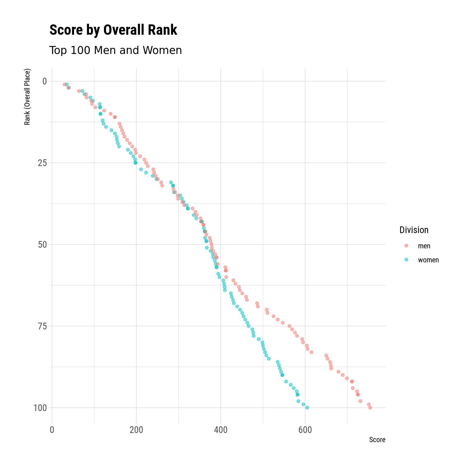 ggplot(all_lb, aes(y = rank, x = score, color = div)) +geom_point(alpha = .5) +scale_y_reverse() +labs(x ="Score",y ="Rank (Overall Place)",title ="Score by Overall Rank",subtitle ="Top 100 Men and Women" ) +scale_color_discrete(name ="Division")