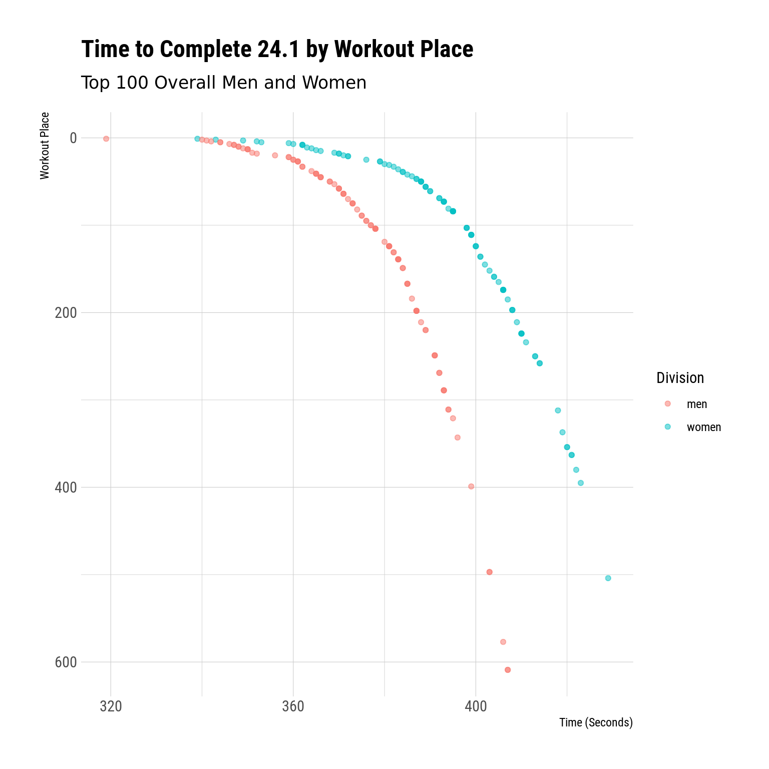 wk1 <- all_workouts |>filter(workout_num ==1) |>mutate(time_score =period_to_seconds(ms(score)))wk1 |>ggplot(aes(x = time_score, y = workout_place, color = div)) +geom_point(alpha = .5) +scale_y_reverse() +scale_color_discrete(name ="Division") +labs(x ="Time (Seconds)",y ="Workout Place",title ="Time to Complete 24.1 by Workout Place",subtitle ="Top 100 Overall Men and Women" )