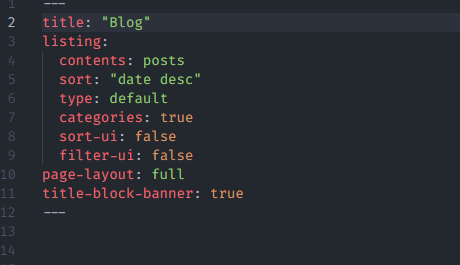 You’ll also want to open up the blog.qmd file and change the title (inside the YAML header) to “Blog”. The header should now look like this: