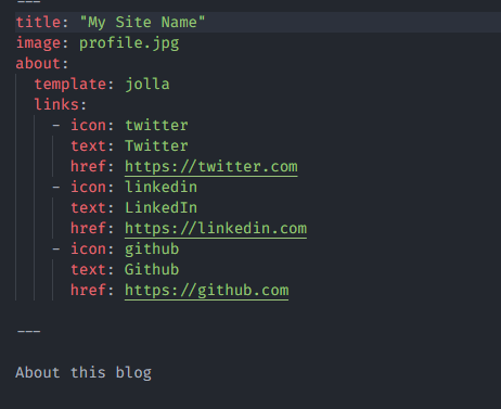 And then within that you can add in whatever content you want – a brief bio, some pictures, whatever. The only thing I include at the outset (beside the content) is a YAML header that looks like this: