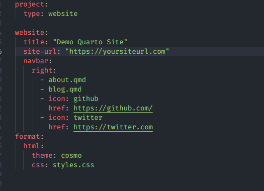 You also might want to change your website title. Either way, after you’re done, your _quarto.yml file should look something like this: