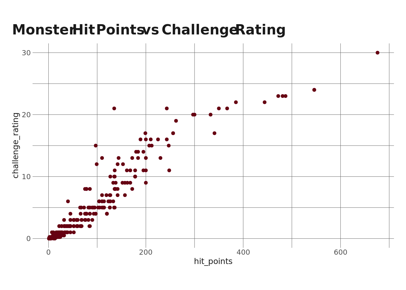 So, we see a very strong correlation between hit points and challenge rating. Let’s plot this.