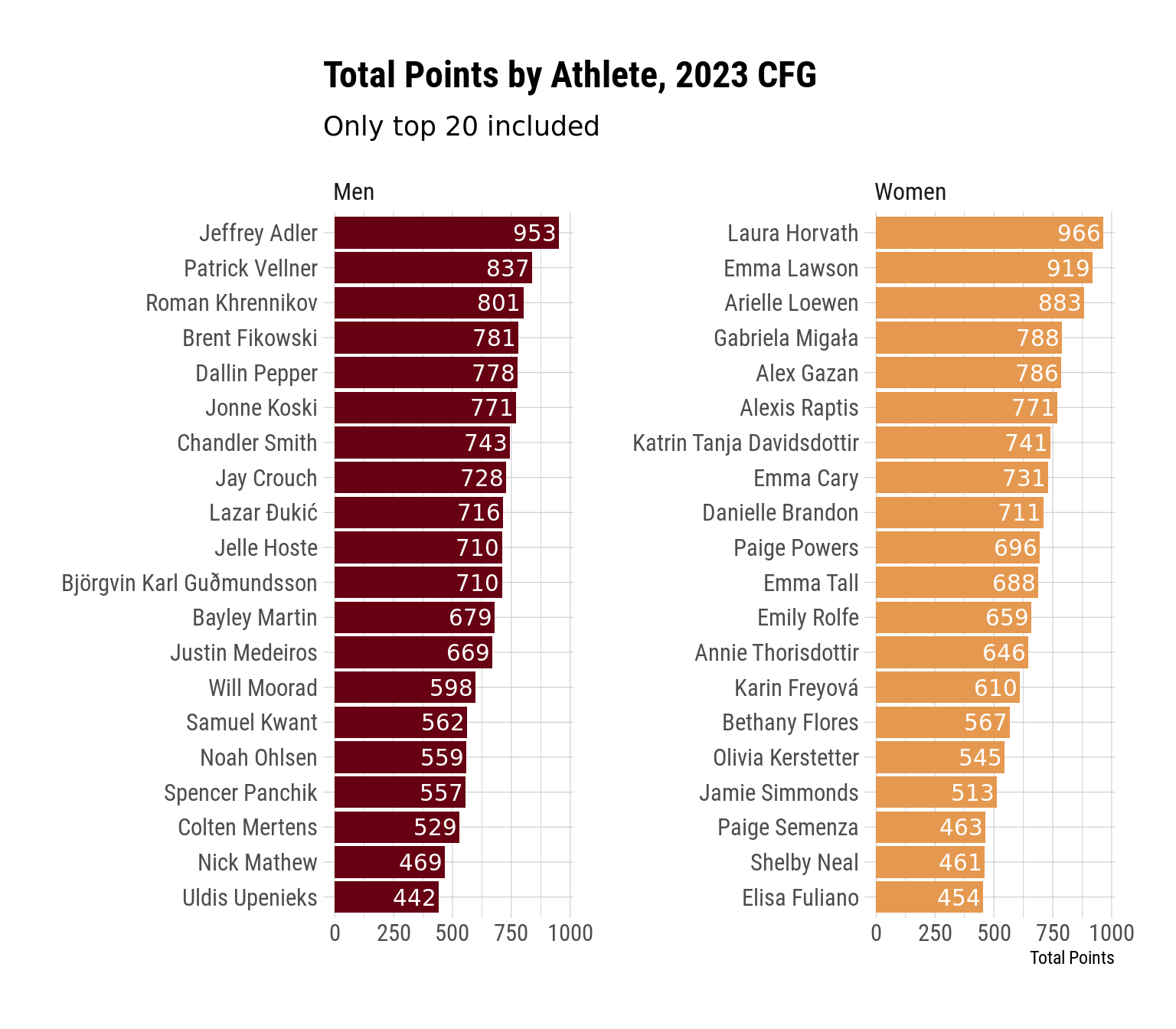Inversely, we can see that some athletes were very inconsistent. For instance, Justin Medeiros, Pat Vellner, and Sam Kwant on the men’s side, and Katrin, Emma Cary, and Olivia Kerstetter on the women’s side. This all makes sense – Justin, Pat, and Sam all had a few terribly events, but as we saw earlier they were also top 3 in multiple events. Likewise for Katrin, Olivia, and Emma.