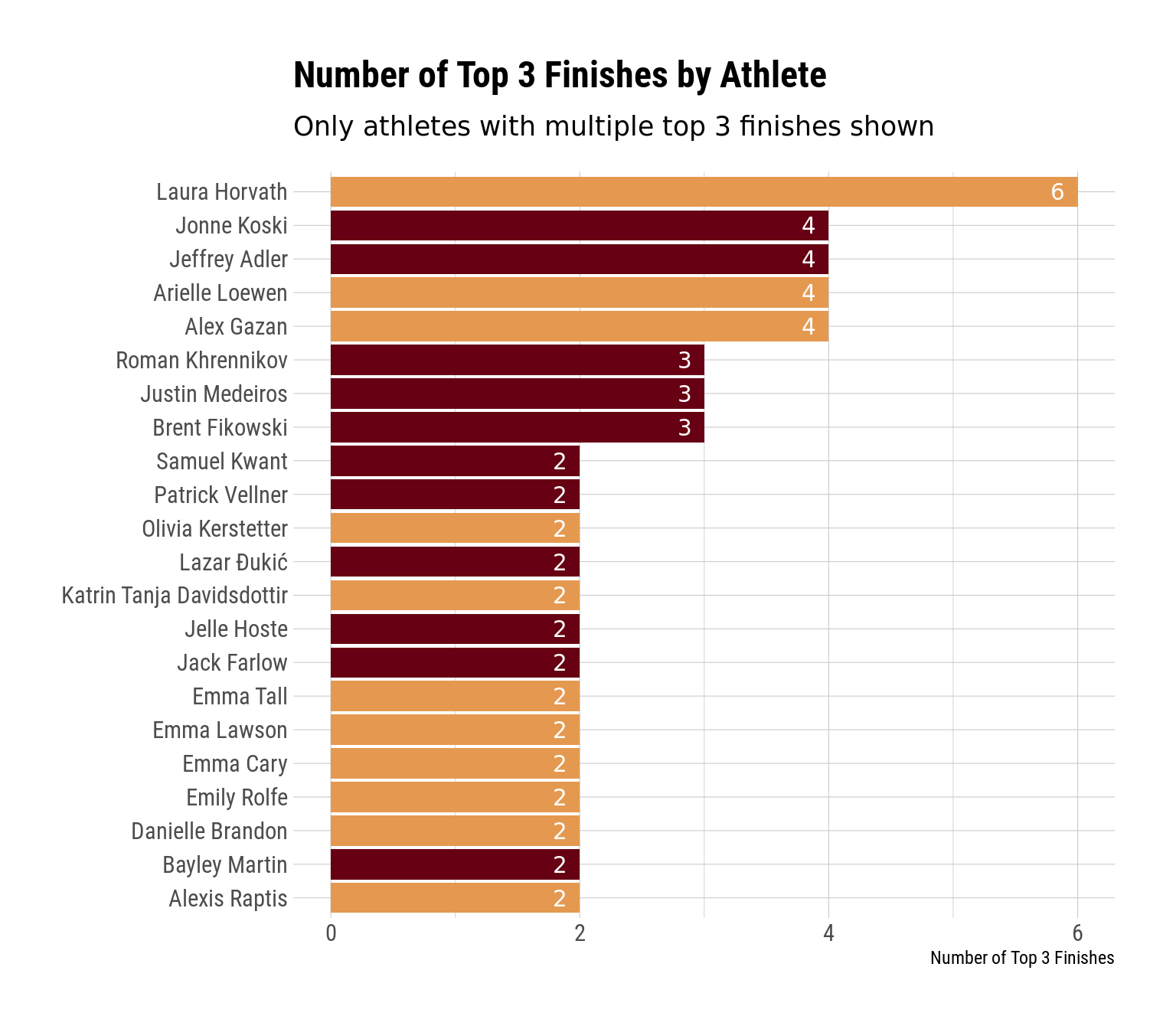 Next, let’s take a look at the number of top 3 finishes by all of our athletes. To preserve some space, I’m only going to include those athletes with multiple top 3 finishes.