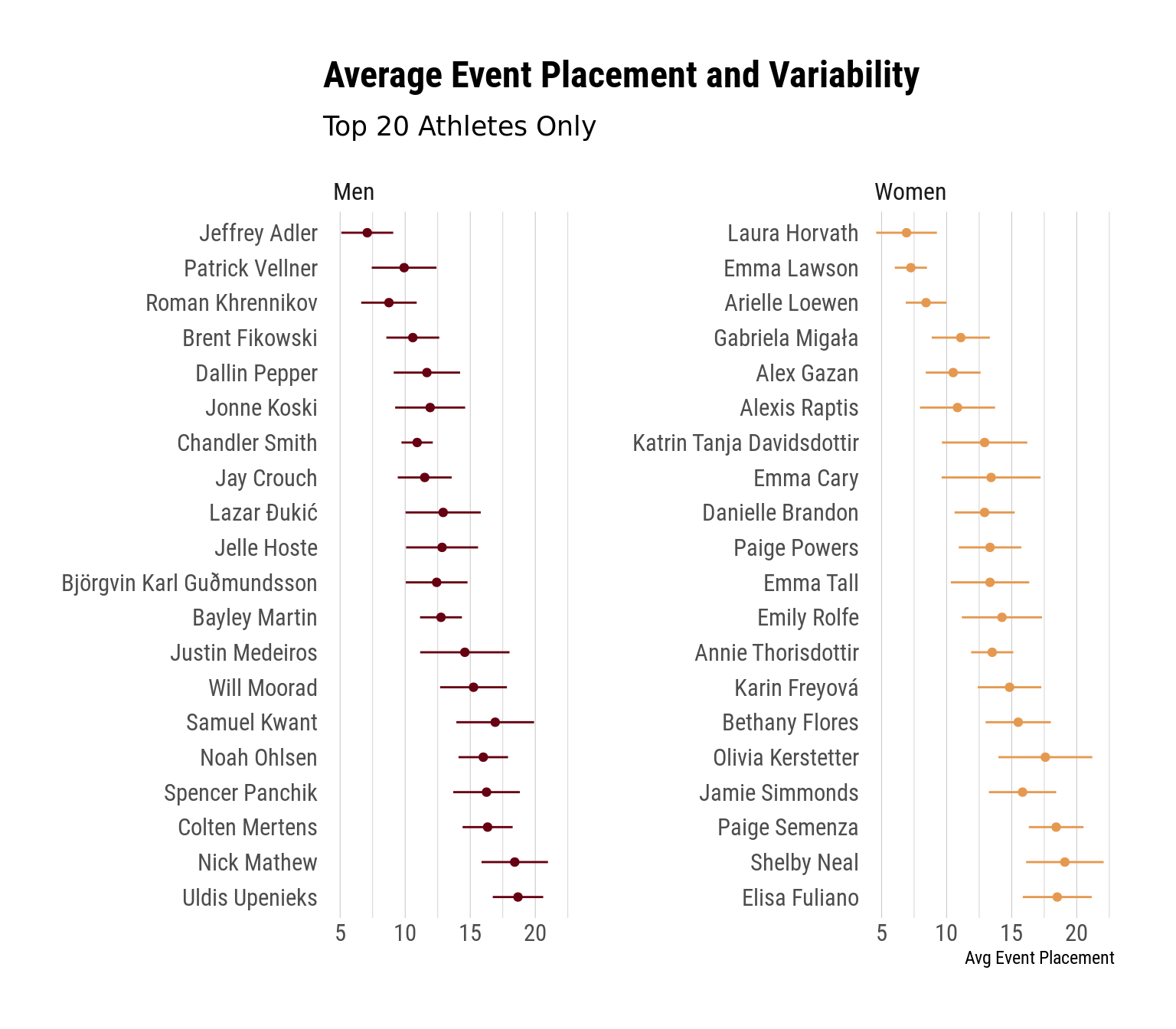 Medeiros’s performance provides a nice segue into the next thing we’ll look at – variability. That is, to what extent were athletes consistent in their finishes. The plot below shows athletes average event placement as a point, and it shows the standard error of this estimate (the variability) as bars extending around the point. The wider the bars, the more variable (less consistent) the athlete was in their finishes.