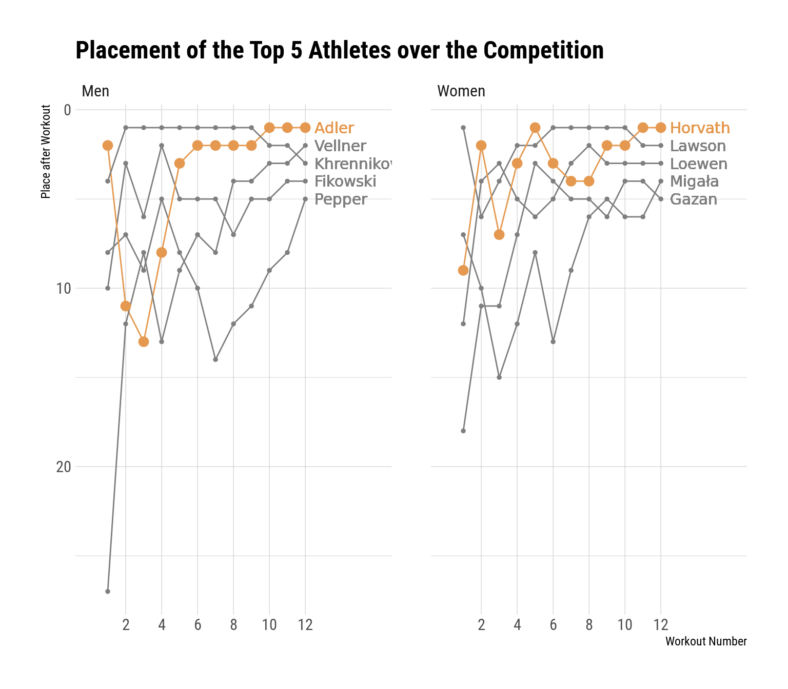 As a penultimate glance at the data, let’s track the overall placement of the eventual top 5 finishers across the competition. I’m going to color the eventual winners in gold and the others in gray, which will make the winners’ trajectories easier to follow and make the graph less busy (although it does make it slightly harder to follow the non-winners’ trajectories).