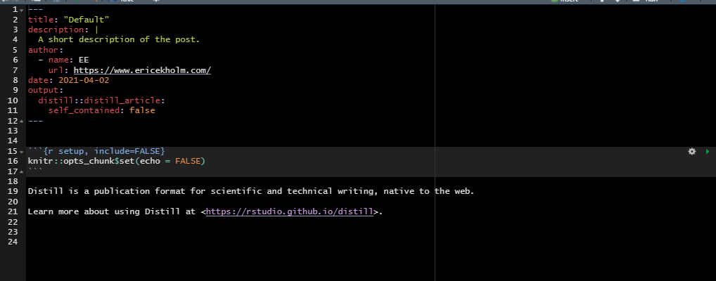 xfun::write_utf8(body, con)These lines will write the contents of the yaml variable (which we just pulled from the distill::create_post() default – we didn’t change anything here) and the body variable (which we just specified above) to con, which is the file we want to edit.