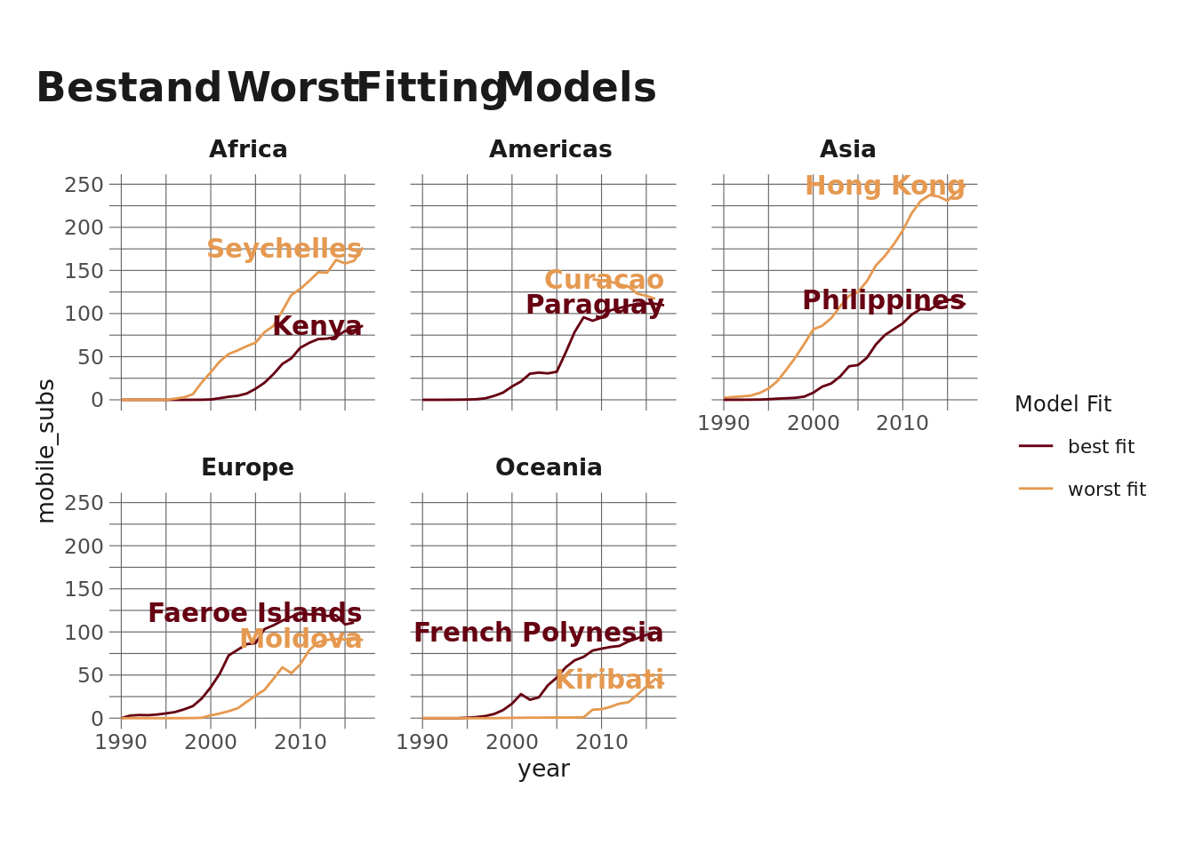 left_join(x = preds_data %>% distinct(entity, continent), y = ., by = "entity")Now, I’m going to pick filter down to the countries in each continent that have the highest R-squared (the country the model performs best on) and the lowest R-squared (the country the model performs worst on). One thing to note is that a low R-squared doesn’t mean the country has few mobile phone subscriptions, it just means that the model does a relatively bad job predicting the mobile phone subscriptions for that country. This could be for a number of reasons, only one of which is that the country has considerably fewer subscriptions each year.