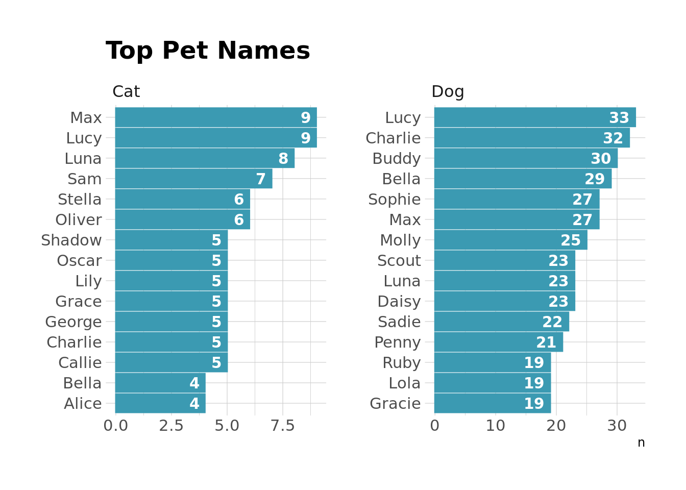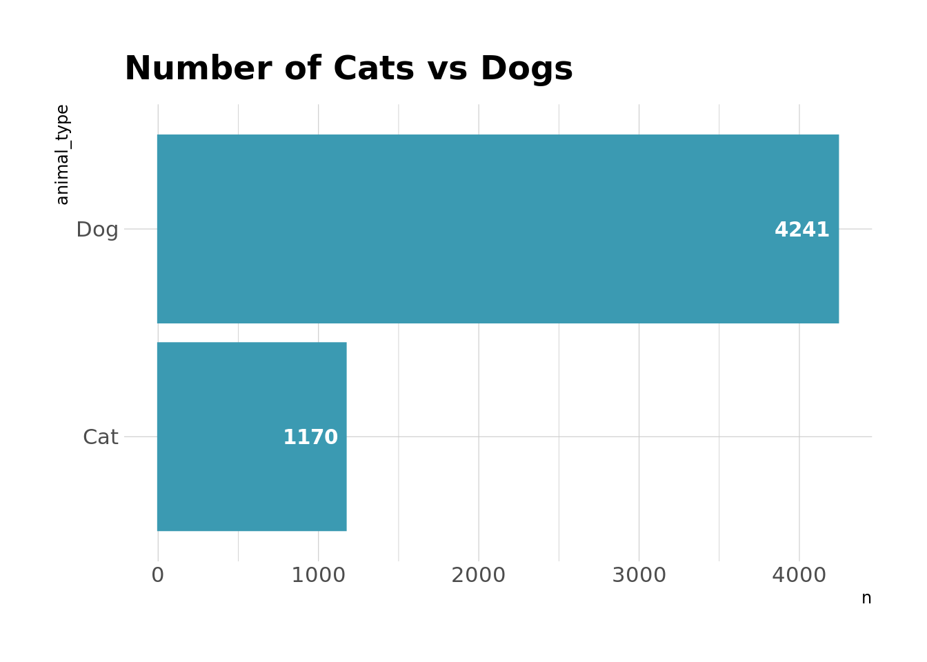geom_text(aes(x = if_else(animal_type == "Cat", n - 1, n - 4), label = n), hjust = 1, color = "white", fontface = "bold") +