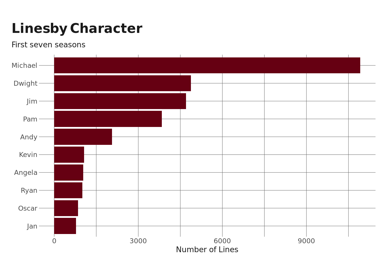 Before modeling data, I would typically do a more thorough EDA. But I’ve already explored this data pretty closely (albeit months ago) in two previous blog posts, so rather than re-doing that EDA, I’m just going to look at those posts. One thing I will include here, though, is a quick look at the number of lines spoken by Michael Scott vs other characters, since this is the outcome I’m interested in predicting here.