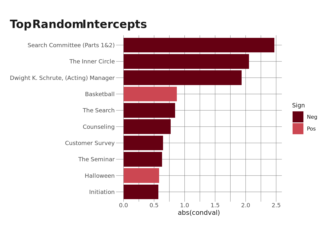 Right, so, the next logical step in my mind is to take a closer look at the random intercepts. We see some variance in the intercept (.23), which suggests that there are meaningful between-episode differences in the number of times Michael Scott speaks. Rather than looking at all of these, let’s take a look at the largest 10 effects (as a benchmark, recall that the mean intercept is -.3)