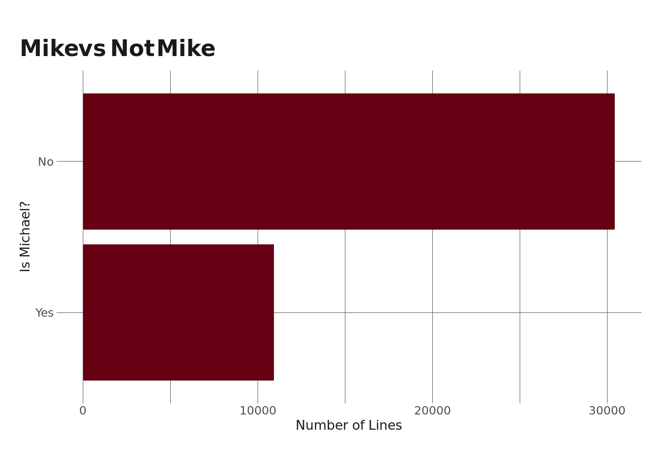 So, Michael has far and away the most lines of any character. But it’ll also be useful to look at Michael vs all of the others lumped together (since this is what I’m actually predicting).
