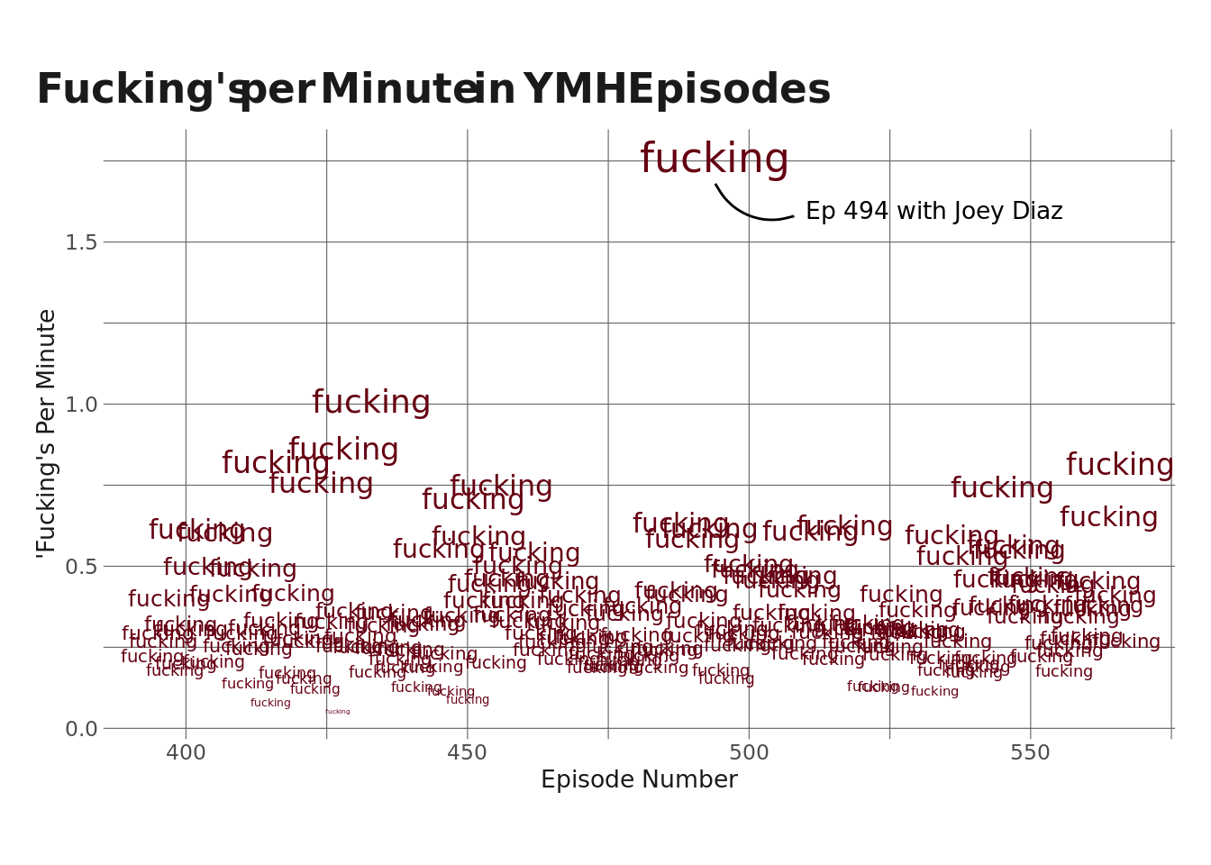 annotate("text", x = 510, y = 1.6, label = "Ep 494 with Joey Diaz", hjust = 0, size = 3.5) +