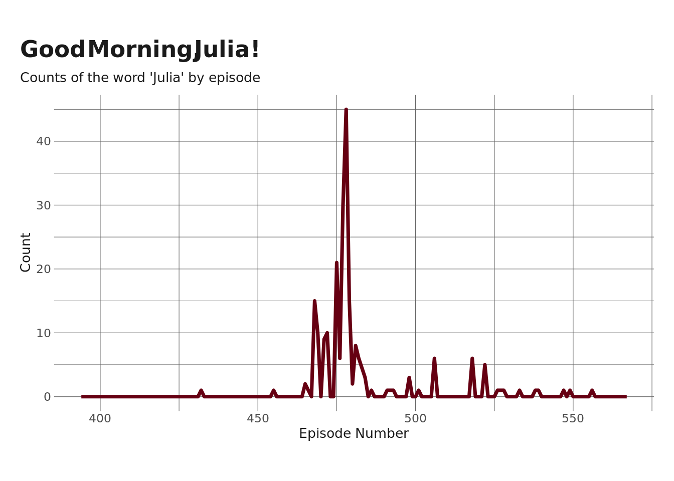 subtitle = "Counts of the word 'Julia' by episode"