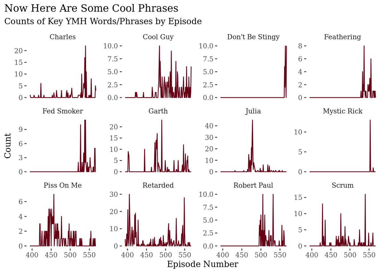 There are tons of other words and phrases I could make this same graph for – “four strokes,” “let me eat ya,” etc. – but I’m going to pick a handful and write a little function that’ll extract those from the transcript and then make a faceted graph similar to the above.