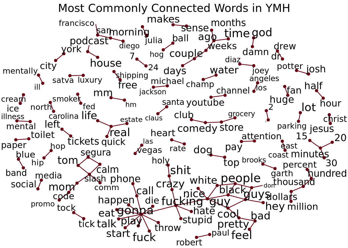 The way to read this graph is to look for words that are connected (note that the direction doesn’t mean anything here – it’s just random). So, the words “tick” and “tock” (TikTok) show up a lot together, as do “toilet” and “paper” (from Tushy reads). Over on the left side, we see more of a wheel-shaped pattern with “gonna” in the middle, which is linked to a bunch of other words – “gonna die,” “gonna throw” (up), “gonna call,” etc. There’s also a little network toward the bottom left where we see connections between guy, guys, black, white, cool, and nice (black guys, cool guys, white guy, etc). A few other standouts to me are “water champ,” “mentall ill”, “robert paul,” and, of course “morning julia.”